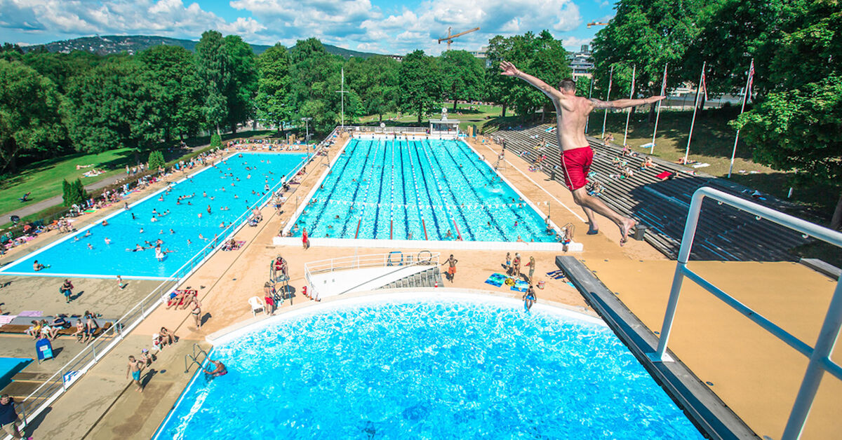 Oslos ikoniske utendørsbad i Frognerparken, åpent om sommeren. To 50-meters bassenger, plaskebasseng for de minste, sklier og stupetårn. Barn under 3 år gratis.